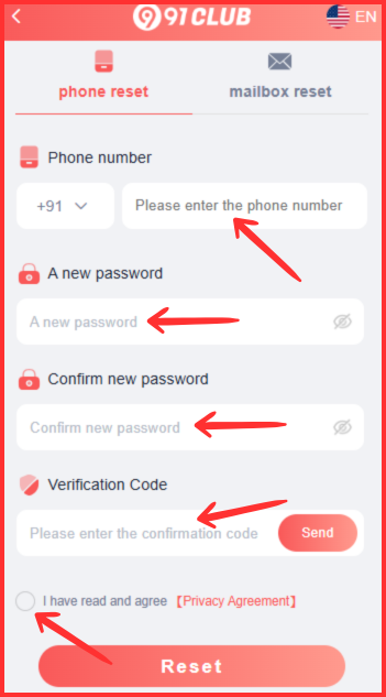 - Reset: Click on reset button. Now, 91 club login password is reset.