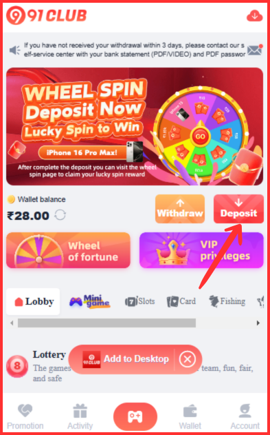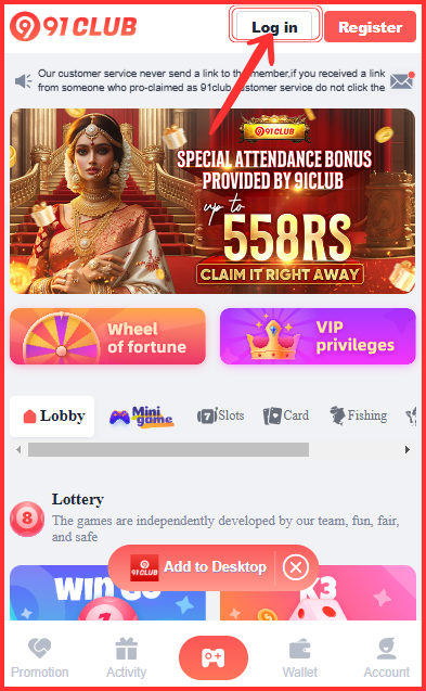 - Add to Desktop: Once logged in, simply click on the “Add to Desktop” icon located above the promotions tab on the homepage. This will start the download of the 91 club game APK file to your device.